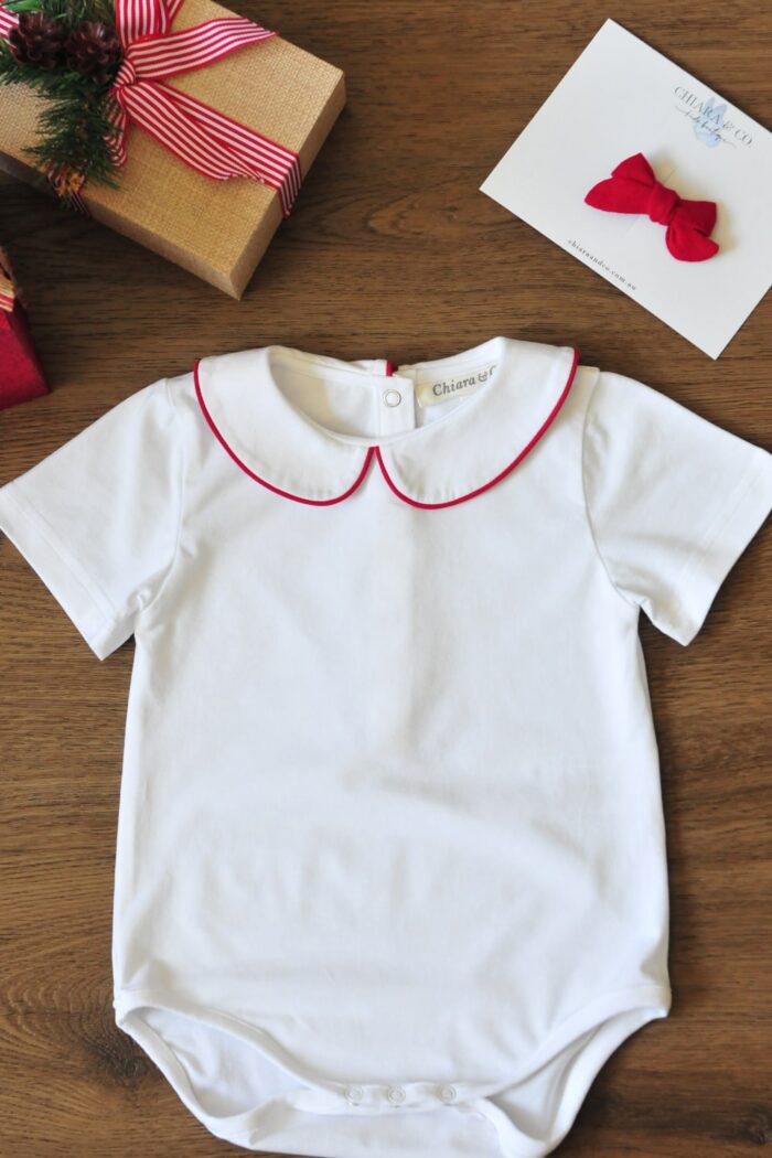 The forever-classic unisex bodysuit is an irresistible addition to your babyโs wardrobe. Designed especially for Chiara & Co., our Garnet Red Piped Collar Classic Bodysuit is made with a cotton blend that is super soft, stretchy, and provides your baby with the ultimate comfort for everyday wear. The Peter Pan collar, adorned with Garnet Red Piping, adds an elegant touch to this bodysuit, making it perfect for both casual and special occasions. This short-sleeved bodysuit includes snap button fastening at the back and between the legs for easy dressing and changing.