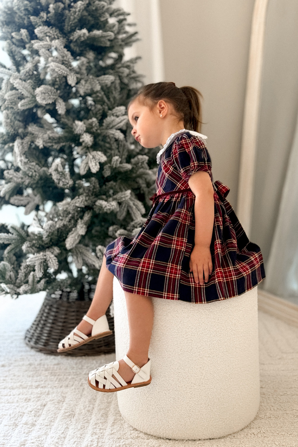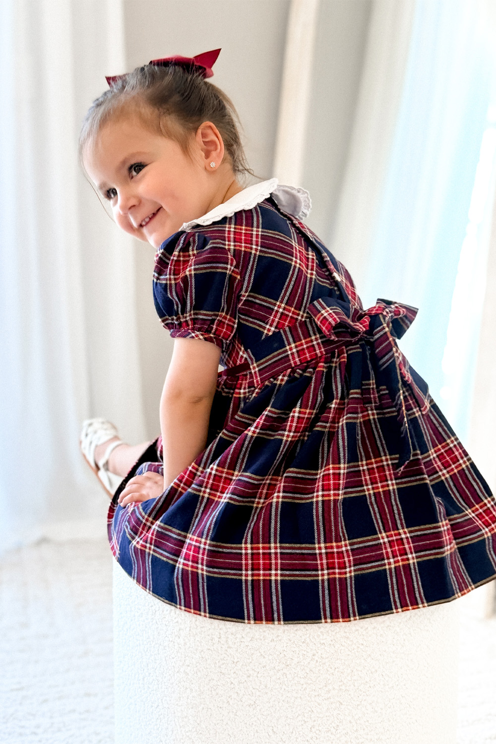 Made from a navy and red tartan check fabric and fully lined for comfort, this timeless dress features a classic white Peter Pan collar finished with delicate lace trim. The puffed sleeves add a traditional touch, while a rich velvet bow at the waist completes the look with festive charm. The sash at the back ties into a charming bow for the perfect finish.