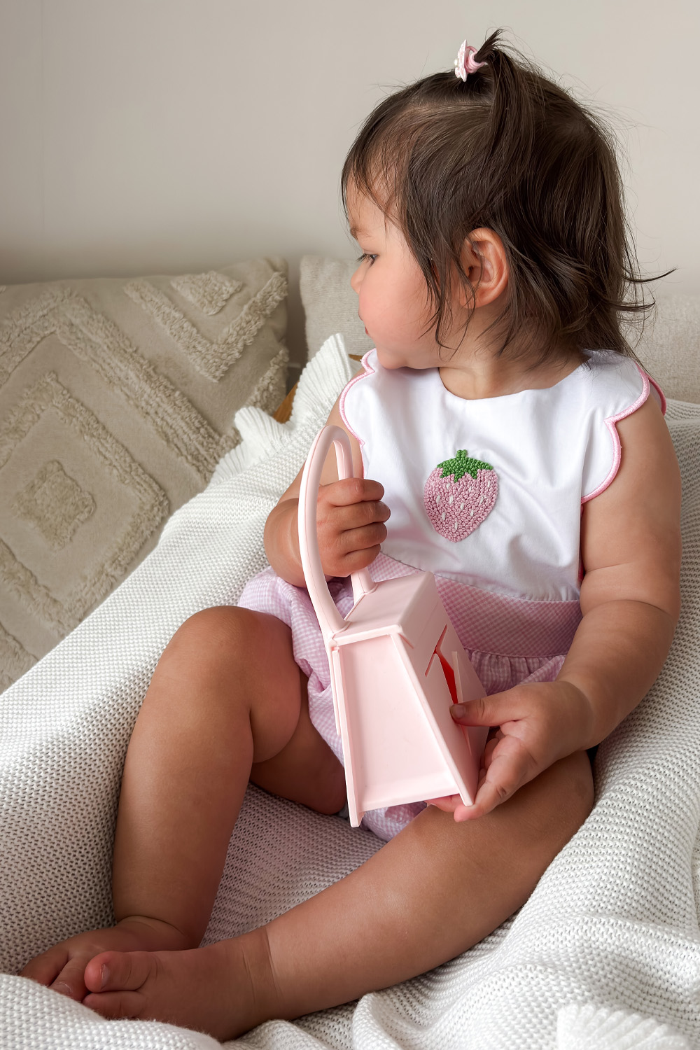 • Hand embroidered French knot strawberry detail