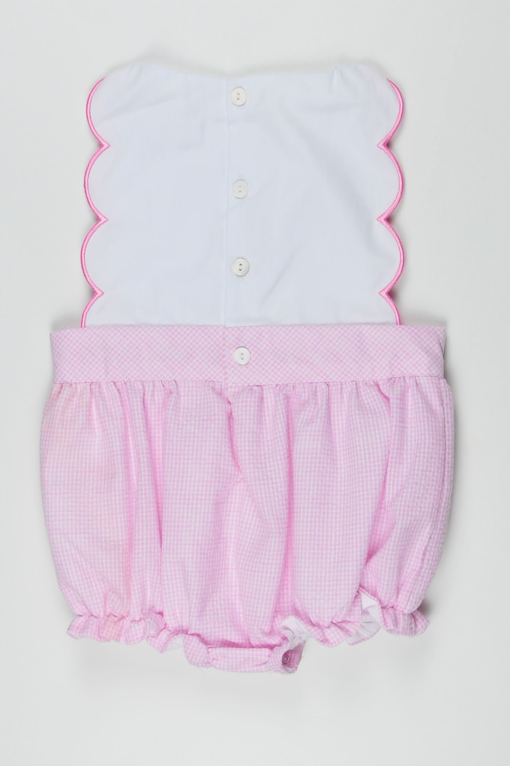 The Strawberry Scallop Romper has scalloped pink trim frames the sleeveless bodice for a playful finish, while the gathered seersucker bubble bottom creates a vintage-inspired silhouette that’s as practical as it is adorable. Mother of Pearl buttons fasten at the back for easy dressing. Designed for both style and practicality, the romper includes snap fastenings between the legs for quick changes, ensuring your baby stays comfortable and stylish all day long.